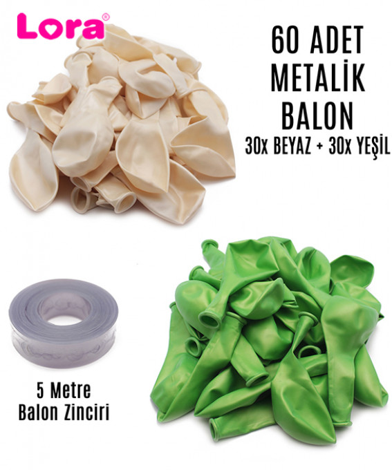 60 Adet Beyaz ve Yeşil Karışık Metalik Balon + 5 Metre Balon Zinciri - 99247