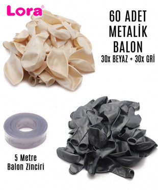 60 Adet Beyaz ve Gri Karışık Metalik Balon + 5 Metre Balon Zinciri - 99248
