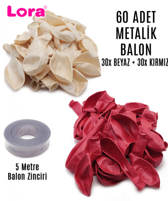 60 Adet Beyaz ve Kırmızı Karışık Metalik Balon + 5 Metre Balon Zinciri - 99250