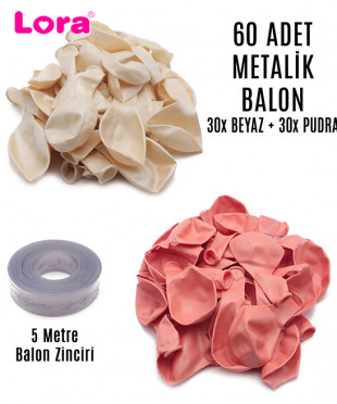 60 Adet Beyaz ve Pudra Karışık Metalik Balon + 5 Metre Balon Zinciri - 99253
